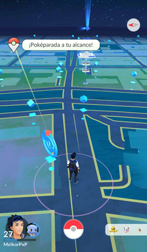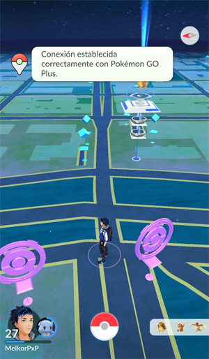 En la pantalla del juego principal, aparecerá el símbolo del Pokémon GO Plus. Toca el símbolo (y el botón del aparato) para reconectar el mismo cada vez que se desconecte. Además, te seńala al Pokémon o a la Poképarada para la cual te ha dado el aviso, de manera que sepas exactamente con cuál vas a interactuar si presionas el botón del aparato. En caso de que un Pokémon y una Poképarada estén ambos en rango, el aparato elegirá siempre primero al Pokémon.